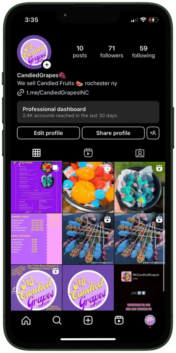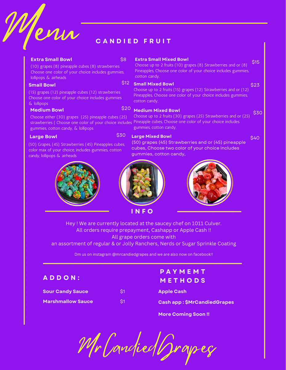 Hey ! We sell candied fruits out of the saucey chef building on 1011 Culver rd, mrcandiedgrapes is a late night idea brought to life, we heat up a candy mixture to 300 degrees, once at that temperature and expertly dip the fruit of your choice in the flavor or flavors that you chose , either left original or coated in crushed jolly ranchers, nerds or a sugar sprinkle coating. our pickup day is sunday from 2pm-4pm, All Orders Require Prepayment !! We Take Cash App, Apple Cash & Cash Dropoff. Candied fruit should be store in the fridge to prevent melting, and it can be stored for a maximum of 3 days !!